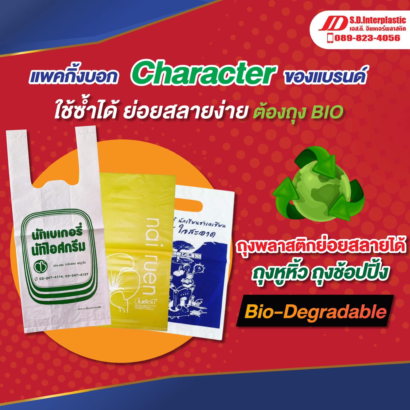 บริษัทเอส.ดี. อินเตอร์พลาสติก รับผลิตถุงพลาสติก พิมพ์ลาย พิมพ์โลโก้ ให้บริการด้านบรรจุภัณฑ์แบบครบวงจร ตั้งแต่ให้คำปรึกษา ออกแบบ ผลิต สินค้าคุณภาพจากเม็ดพลาสติกเกรดเอ เนื้อ HD และ PE ประสบการ์ณยาวนานกว่า 20ปี สินค้าที่รับผลิต มี 6ประเภทหลัก 1. ถุงซิป ซองยา สำหรับร้านถ่ายรูป studio คลินิกร้านยา โรงพยาบาล เครืื่องประดับ จิวเวลรี่ 2. ซองรับงานร้านถ่ายรูปแบบขั้วฉีก 2ตอน และ 3ตอน สำหรับร้านถ่ายรูป studio 3. ถุงหิ้ว ทรงเสื้อกล้าม สำหรับใส่สินค้าทั่วไป อาหาร หนังสือ เสื้อผ้า 4. ถุงตัดตรงเจาะหูกลม สำหรับสินค้าที่ต้องการรูปทรงสวยงาม หรือมีน้ำหนักมาก เช่น กรอบรูป ปุ๋ย 5. ถุงพลาสติกพิมพ์ลาย ใส่ขนม Bakery สายไฟ ชิ้นส่วนอิเล็กทรอนิกส์ อะไหล่ ดิน ข้าวสาร 6. ซองพลาสติกใส่ช้อนส้อม ถุงครอบแก้วน้ำ สินค้าใหม่สำหรับร้านอาหาร โรงพยาบาล มีทั้งแบบพิมพ์และไม่พิมพ์ บริการของเรา 1. ถูกใจ & ไม่แพง ให้คำปรึกษาแนะนำสินค้า การสั่งผลิตถุงให้ตรงความต้องการลูกค้า ใส่สินค้าของท่านแล้วสวยงาม เป็นที่สนใจ และสั่งอย่างไรให้ได้สินค้าในที่ราคาเหมาะสม 2. บริการดีไซน์แบบพิมพ์ ออกแบบงานอาร์ตเวิร์ค ก่อนผลิต เสริมให้แบรนด์สินค้าของท่านโดดเด่น 3. ผลิตถุงพลาสติกเกรดA จากเม็ดพลาสติกเกรดA 4. ปริมาณการสั่งขั้นต่ำที่เหมาะกับ ธุรกิจดั้งเดิมที่มีชื่อเสียงมายาวนาน และ SME Startup ร้านค้าขนาดกลางและขนาดย่อม 5. ให้บริการทุกจังหวัดทั่วประเทศ ติดต่อง่าย เป็นที่ไว้วางใจจากลูกค้ากว่า 20 ปี สนใจผลิตถุงพลาสติกพิมพ์กับ เอส.ดี. อินเตอร์พลาสติก ท่านสามารถติดต่อผ่านช่องทาง: ID Line: @sdinterplastic, srettapong.sd ฝ่ายขาย: 089-823-4056, 095-550-8568, 084-979-1652 Email: sdinterplastic@hotmail.com